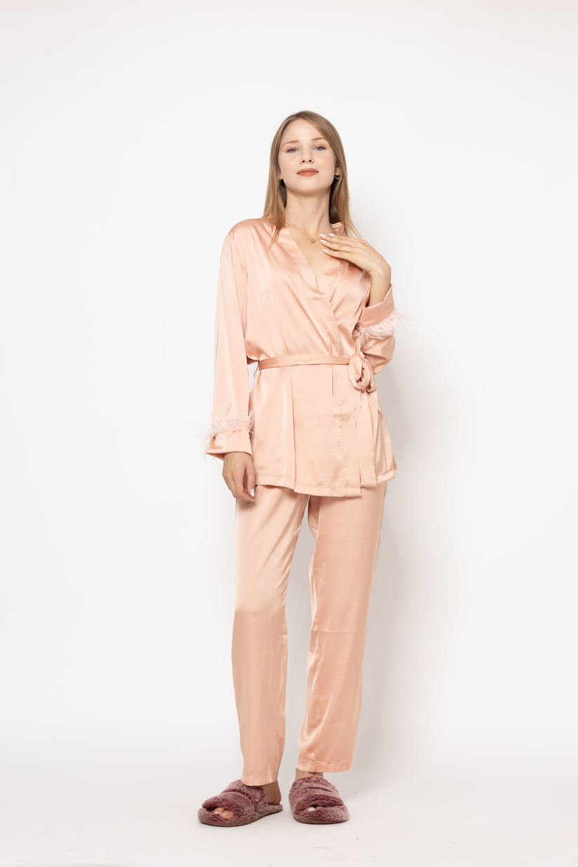 • kimono long, avec une touche de plume sur les manches, et une ceinture à la taille